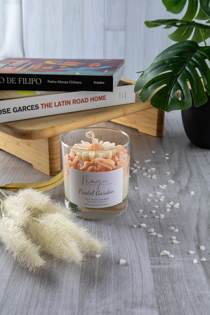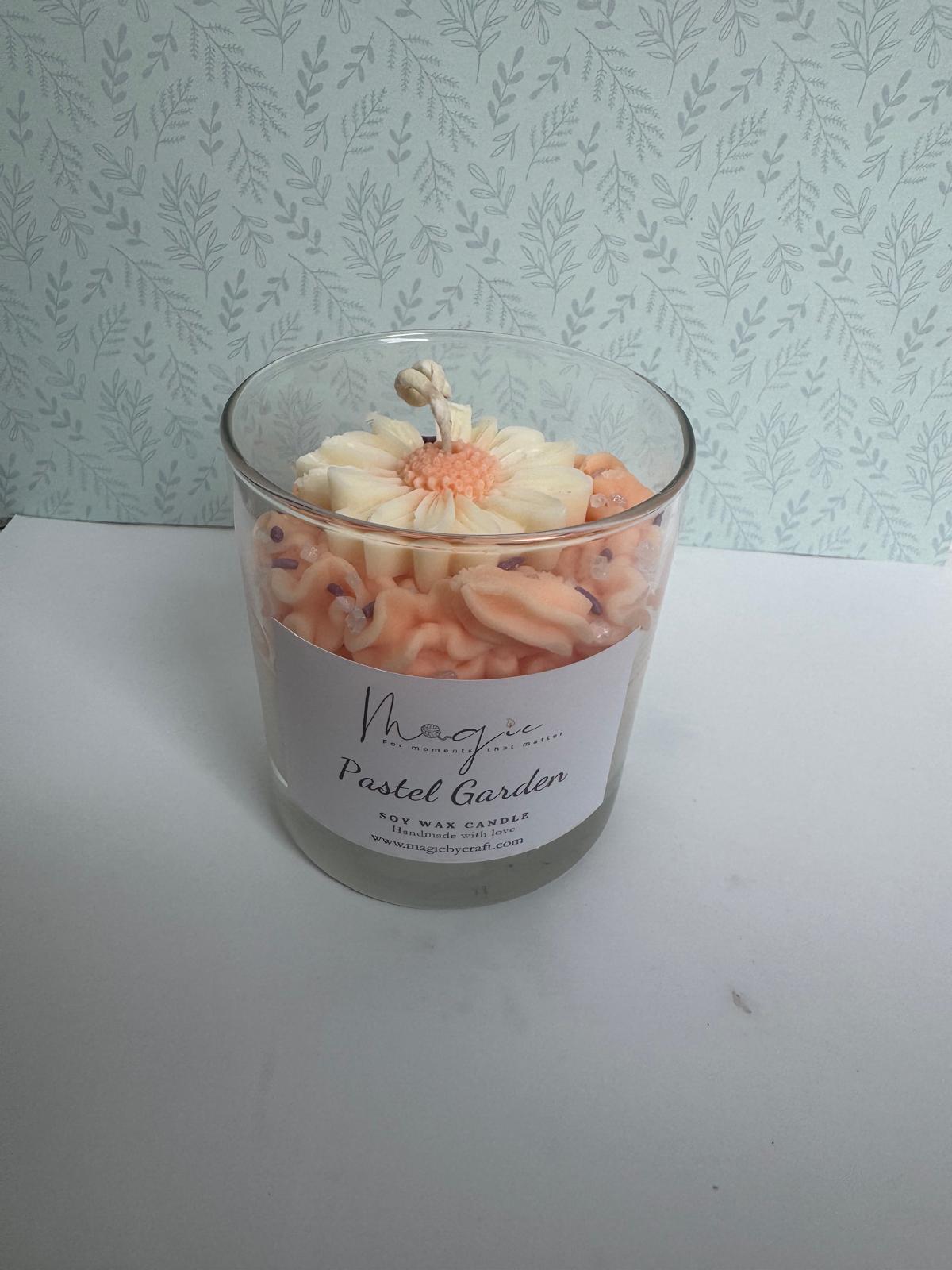 Bring a touch of elegance to your space with this pastel-inspired candle, handcrafted with natural soy wax. Topped with a swirl of orange cream Chantilly and a delicate white daisy with a vibrant orange center, it’s both a fragrance and a decorative piece.